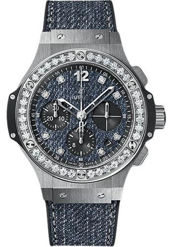 41 mm satin-finished stainless steel case, polished and satin-finished stainless steel bezel set with 36 diamonds for 1.80k, sapphire crystal with anti-reflective treatment, genuine blue jeans dial with black subdials and 8 diamonds for 0.14k, HUB 4300 self-winding chronograph movement, approximately 42 hours of power reserve, black and blue rubber genuine blue jeans strap with grey or black stitching, stainless steel deployant buckle. Water resistant to 100 m.