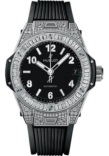 39 mm polished stainless steel case set with 118 diamonds (~0.84ct), polished 18K white gold bezel polished 18k white gold set with 48 baguette-cut diamonds (~1.90cts) and 6 H-shaped titanium screws, sapphire crystal with anti-reflective treatment, mat black dial, HUB1710 self-winding movement, approximately 50 hours of power reserve, black structured lined rubber strap, stainless steel deployant buckle. Water resistant to 100 meters.