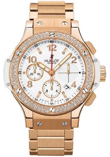 41mm 18K red gold case, 18K red gold bezel set with 114 diamonds, white dial, self winding HUB 4300 movement with chronograph function, approximately 42 hours of power reserve, 18K red gold bracelet. Water resistant to 100 meters.