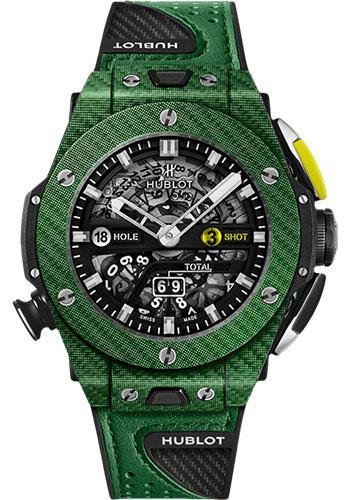 45 mm carbon fiber and green texalium upper layer case, carbon fiber and green texalium upper layer bezel with 6 H-shaped titanium screws, black composite resin lower bezel, sapphire crystal with anti-reflective treatment, matte black skeleton dial, HUB1580 UNICO manufacture self-winding movement, approximately 72 hours of power reserve, black rubber with carbon fiber texture decor and green calf leather strap, additional black fabric straps with black-plated aluminium buckle. Water resistant to 100m (10 ATM).