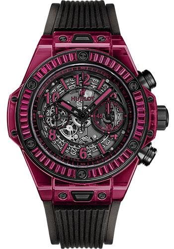 45 mm polished red sapphire crystal case, polished black-plated bezel set with 48 baguette-cut rubies with 6H-shaped black-plated titanium screws, sapphire crystal with anti-reflective treatment, polished and smoked transparent composite resin skeleton dial with red luminescent appliques, HUB1242 UNICO self-winding movement with flyback chronograph and column wheel, approximately 72 hours of power reserve, black smoked transparent structured lined straps structured lined rubber strap, black ceramic and black-plated titanium deployant buckle. Water resistant to 100 meters.