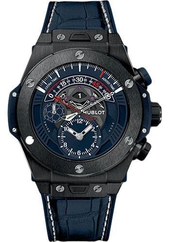 45 mm satin-finished black ceramic case, polished and satin-finished black ceramic bezel with dark blue composite resin lower, sapphire crystal with anti-reflective treatment, mat dark blue dial with with printed logo in the small second counter, HUB 1261 self-winding bi-retrograde movement with central chronograph and column wheel, approximately 72 hours of power reserve, dark blue rubber and alligator strap with white stitching, black-plated titanium deployant buckle. Water resistant to 100 m.