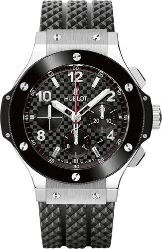 44mm stainless steel case, black ceramic bezel, black carbon dial, self winding HUB 44 movement with chronograph function, approximately 42 hours of power reserve, black rubber strap with deployant buckle. Water resistant to 100 meters.