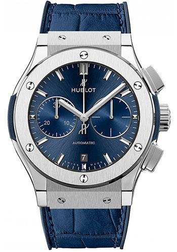 42 mm satin-finished and polished titanium case, satin-finished and polished titanium bezel with 6 H-shaped titanium screws, sapphire crystal with anti-reflective treatment, blue sunray dial, HUB 1153 self-winding movement with chronograph, approximately 42 hours of power reserve, blue rubber and alligator strap, deployant buckle. Water resistant to 50 meters.