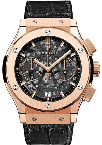 45mm satin-finished 18K King gold case, sapphire crystal back, satin-finished 18K King gold bezel, black composite resin bezel lugs, sapphire dial with appliques and gold-plated counter ring, self winding HUB 1155 movement with Aero chronograph function, approximately 42 hours of power reserve, black rubber and alligator strap with deployant buckle. Water resistant to 50 meters.
