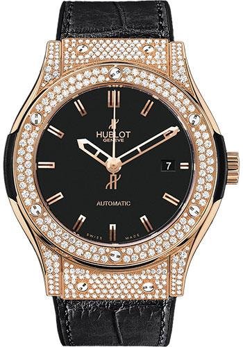 45mm 18K King red gold case set with 208 diamonds (1.75ct), sapphire crystal back, 18K red gold bezel set with 126 diamonds (1.60ct), black composite resin lateral inserts and bezel lugs, mat black dial, self winding HUB 1112 movement, approximately 42 hours of power reserve, black rubber and alligator strap with deployant buckle. Water resistant to 50 meters.