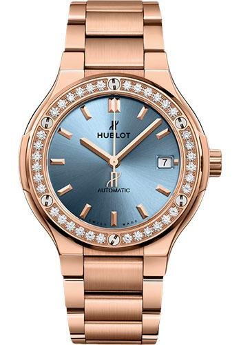 38 mm satin and polished 18K King gold case, polished 18K King gold bezel polished 18k king gold set with 36 diamonds (~1.20.cts) and 6 H-shaped titanium screws, sapphire crystal with anti-reflective treatment, satin-finished light blue sunray dial, HUB1110 self-winding movement, approximately 42 hours of power reserve, satin-finished and polished 18k king gold bracelet bracelet, 18K King gold deployant buckle. Water resistant to 50 meters.
