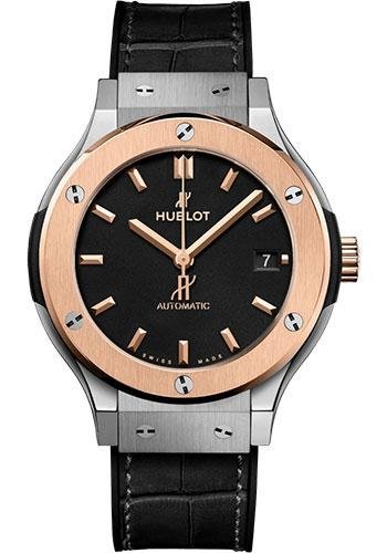 38 mm satin-finished and polished titanium case, vertical satin-finished 18K king gold bezel with 6 h-shaped titanium screws, sapphire crystal with anti-reflective treatment, matte black dial, HUB1110 self-winding movement, approximately 42 hours of power reserve, black rubber and alligator leather strap, 18K king gold and stainless steel deployant buckle. Water resistant to 50m (5 ATM).