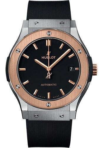 45 mm satin-finished and polished titanium case, vertical satin-finished 18K king gold bezel with 6 h-shaped titanium screws, sapphire crystal with anti-reflective treatment, matte black dial, HUB1112 self-winding movement, approximately 42 hours of power reserve, black lined rubber strap, stainless steel deployant buckle. Water resistant to 50m (5 ATM).
