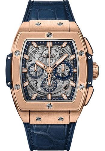 42 mm satin-finished and polished 18k king gold case, satin-finished, polished and microblasted 18K king gold bezel with 6 h-shaped titanium screws, sapphire crystal with anti-reflective treatment, sapphire dial, HUB4700 self-winding skeleton chronograph movement, approximately 50 hours of power reserve, blue rubber and alligator leather strap, 18K king gold and black-plated titanium deployant buckle. Water resistant to 100m (10 ATM).