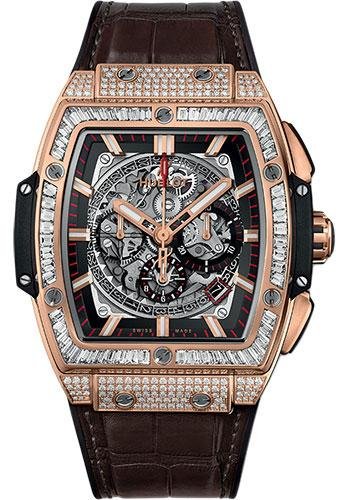 45 mm polished 18k king gold case set with 168 diamonds for 1.12cts, polished 18K king gold bezel set with 60 baguette-cut diamonds for 2.97cts with, 6 H-shaped titanium screws, sapphire crystal with anti-reflective treatment, sapphire dial, HUB4700 self-winding skeleton chronograph movement, approximately 50 hours of power reserve, black rubber and brown alligator strap, 18K king gold and black-plated titanium deployant buckle. Water resistant to 100m (10 ATM).