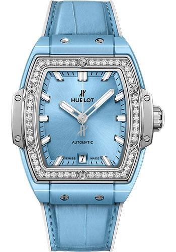 39 mm polished and satin-finished light blue ceramic case, polished titanium bezel set with 50 diamonds for ~1.0ct, 6 H-shaped titanium screws, sapphire crystal with anti-reflective treatment, satin-finished light blue sunray dial, HUB1710 self-winding movement, approximately 50 hours of power reserve, white rubber and light blue alligator strap, stainless steel deployant buckle. Water resistant to 100m (10 ATM).