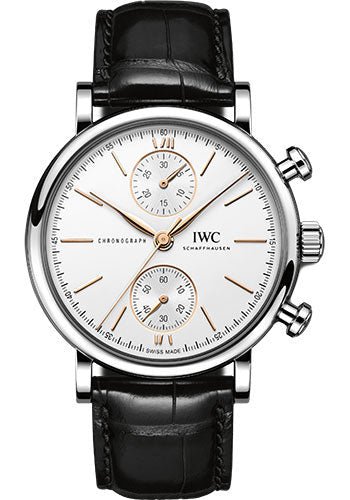 39.0 mm stainless steel case, 12.7 mm thick, convex sapphire glass crystal with antireflective coating on both sides, silver-plated dial, calibre 79350 automatic movement with chronograph, hours, minutes, approximately 44 hours of power reserve, black alligator leather strap. Water resistant to 3 bar.