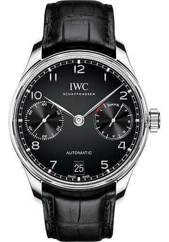 IWC Portugieser Automatic Watch – 42.3 mm Stainless Steel Case – Black Dial – Black Alligator Strap – IW500703