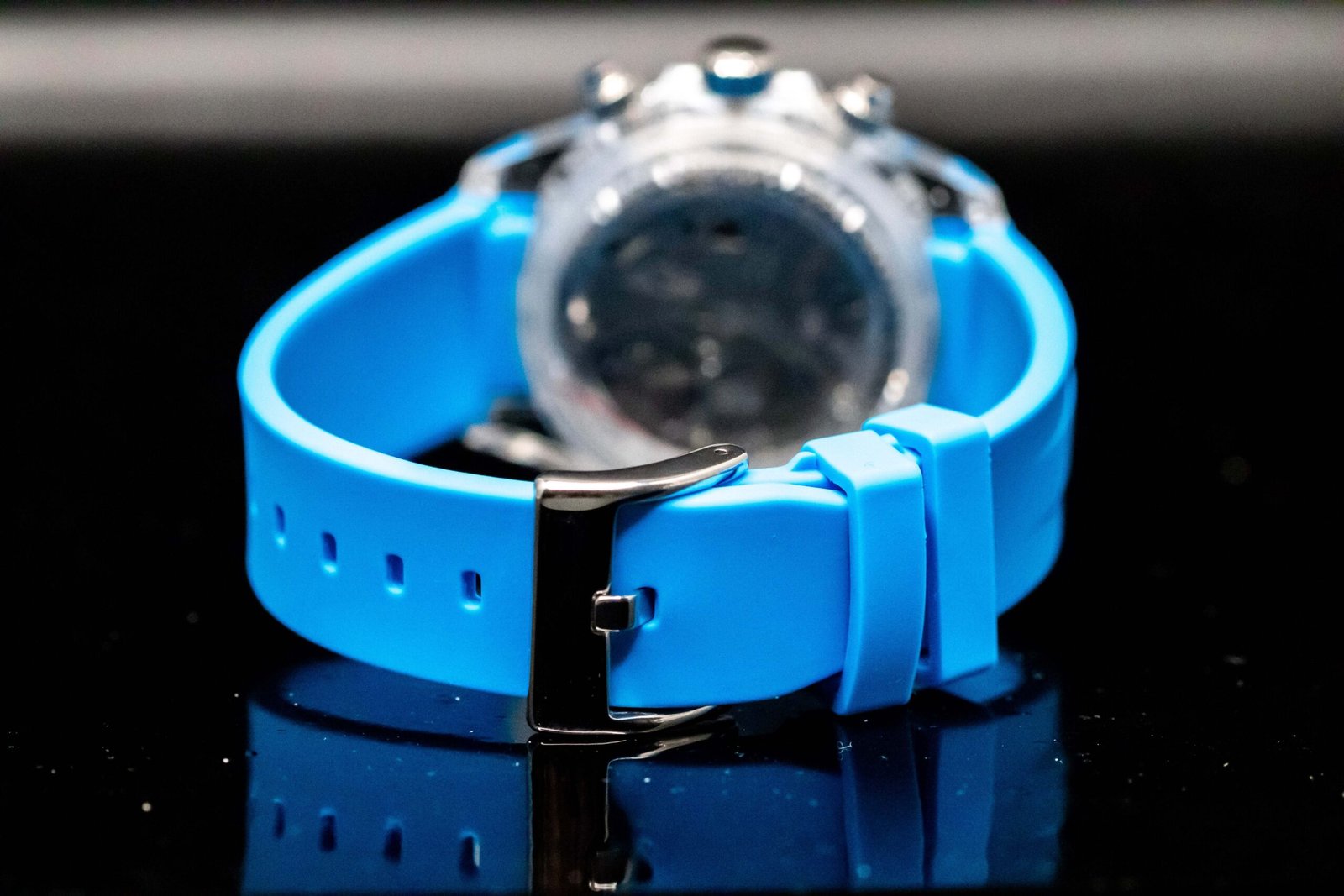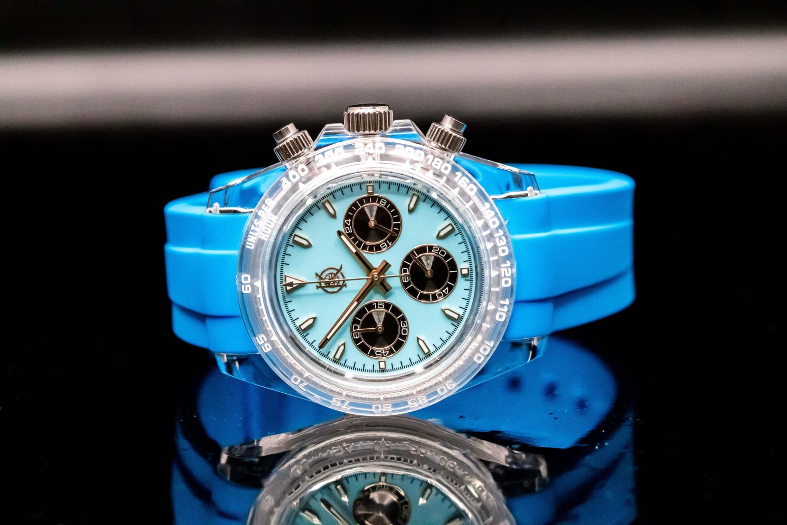 Its ceramic bezel, custom dial layout, and brushed case offer a sleek yet aggressive profile, while the textured rubber strap ensures all-day comfort and durability, whether you’re behind the wheel or on the move.