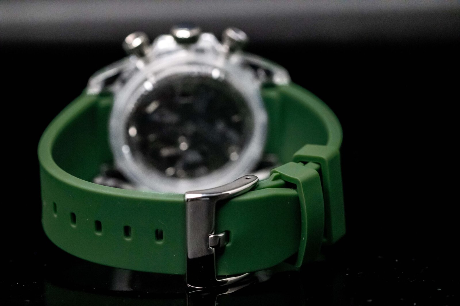 Its ceramic bezel, custom dial layout, and brushed case offer a sleek yet aggressive profile, while the textured rubber strap ensures all-day comfort and durability, whether you’re behind the wheel or on the move.