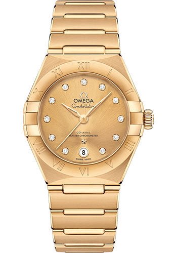 29 mm 18K yellow gold case, transparent back, bezel engraved with Roman numerals, domed scratch-resistant sapphire crystal anti-reflective treatment on both sides, sun-brushed champagne dial with diamond hour markers and a date window at the 6 o’clock position, Caliber Omega 8701 self winding movement with co-axial escapement, chronometer, date, day-date, approximately 50 hours of power reserve, yellow gold bracelet. Water resistant to 5 bar (50 metres / 167 feet).