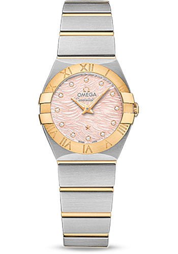 24 mm stainless steel case, sapphire back, 18k yellow gold bezel with engraved roman numerals, domed scratch-resistant sapphire crystal with anti-reflective treatment inside, pink mother-of-pearl dial with diamonds, caliber 1376 quartz movement with rhodium-plated finish, approximately 48 months of power reserve, stainless steel bracelet with 18K gold links. Water resistant to 10 bar.