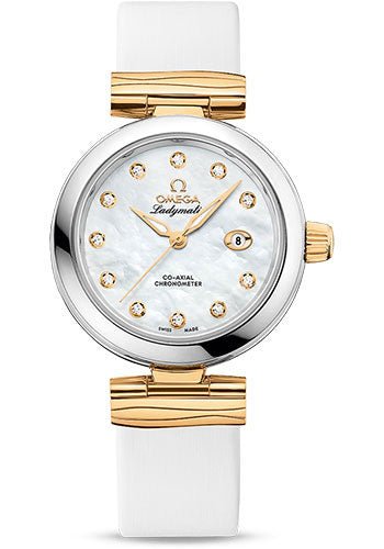 34 mm steel case, transparent back, self-locking crown, steel bezel, sapphire crystal with anti-reflective treatment on both sides, white dial set with 11 diamonds indexes, caliber 8520 self-winding movement with date window at 3 o’clock, approximately 50 hours of power reserve, white leather strap. Water resistant to 100 m (330 ft).