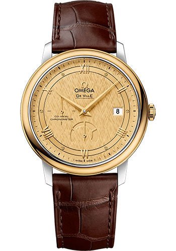 39.5 mm stainless steel and 18K yellow gold case, scratch-resistant sapphire crystal anti-reflective treatment inside, champagne dial with a silk-like pattern and an opaline finish, Caliber Omega 2627 self winding movement with rhodium-plated finish, chronometer, date, power reserve indicator, approximately 48 hours of power reserve, brown leather strap. Water resistant to 3 bar (30 metres / 100 feet).