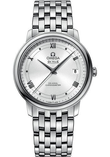 36.8 mm stainless steel case, scratch-resistant sapphire crystal anti-reflective treatment inside, white dial with polished Roman numeral hour markers and cabochons, Caliber Omega 2500 self winding movement with rhodium-plated finish, chronometer, date, approximately 48 hours of power reserve, stainless steel bracelet. Water resistant to 3 bar (30 metres / 100 feet).