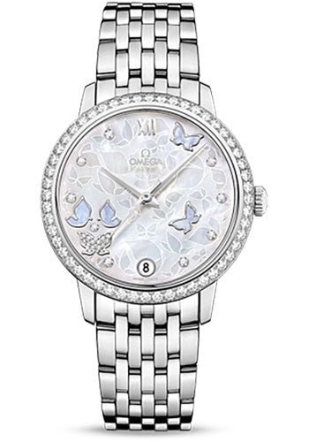 36.8 mm 18K white gold case, diamond bezel, domed scratch-resistant sapphire crystal with anti-reflective treatment inside, white mother-of-pearl dial with decorative butterfly design and nine diamond indexes in 18K yellow gold holders, self-winding chronometer Omega 2500 movement with Co-Axial Escapement, approximately 48 hours of power reserve, 18K white gold bracelet. Water resistant to 100 m.