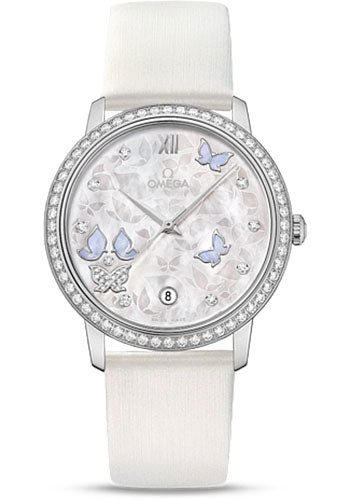 36.8 mm 18K white gold case, diamond bezel, domed scratch-resistant sapphire crystal with anti-reflective treatment inside, white mother-of-pearl dial with decorative butterfly design and nine diamond indexes in 18K yellow gold holders, self-winding chronometer Omega 2500 movement with Co-Axial Escapement, approximately 48 hours of power reserve, white leather strap. Water resistant to 100 m.