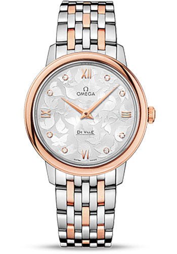 32.7 mm stainless steel case, sapphire back, 8K red gold bezel bezel, domed scratch-resistant sapphire crystal with anti-reflective treatment inside, silver dial set with diamonds and a unique butterfly pattern achieved using a ramolayage pounced ornament technique, caliber 4061 quartz movement set with long life feature to maximize the autonomy of the battery and exclusive red omega logo with rhodium plated parts and circular graining, approximately 48 months of power reserve, red gold-steel bracelet. Water resistant to 3 bar.