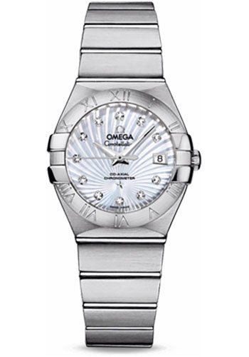 27 mm brushed stainless steel case, transparent back, domed scratch-resistant sapphire crystal with anti-reflective treatment both sides, white mother-of-pearl supernova dial with diamond hour markers, self-winding chronometer Omega 8520 movement with Co-Axial Escapement, date, and seconds, approximately 50 hours of power reserve, stainless steel bracelet. Water resistant to 100 m.