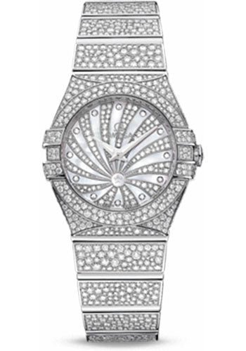 24 mm 18K white gold case entirely paved with Snow-set round diamonds, Snow-set diamond bezel, domed scratch-resistant sapphire crystal with anti-reflective treatment on both sides, white mother-of-pearl dial with diamond hour markers and diamond paved 18K white gold supernova structure, quartz Omega 1376 movement, approximately 32 months of power reserve, 18K white gold bracelet entirely paved with Snow-set round diamonds. Water resistant to 100 m.