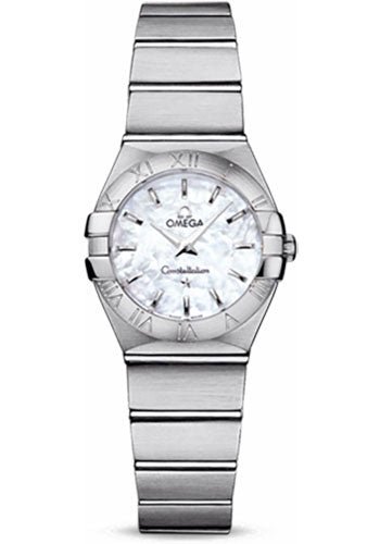 24 mm brushed stainless steel case, domed scratch-resistant sapphire crystal with anti-reflective treatment inside, white mother-of-pearl dial, quartz Omega 1376 movement, approximately 32 months of power reserve, stainless steel bracelet. Water resistant to 100 m.