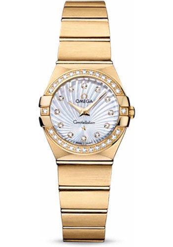 24 mm brushed 18K yellow gold case, diamond bezel, domed scratch-resistant sapphire crystal with anti-reflective treatment inside, white mother-of-pearl shell dial with diamond hour markers, quartz Omega 1376 movement, approximately 32 months of power reserve, 18K yellow gold bracelet. Water resistant to 100 m.