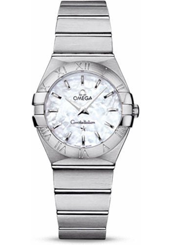 27 mm brushed stainless steel case, domed scratch-resistant sapphire crystal with anti-reflective treatment inside, white mother-of-pearl dial, quartz Omega 1376 movement, approximately 32 months of power reserve, stainless steel bracelet. Water resistant to 100 m.