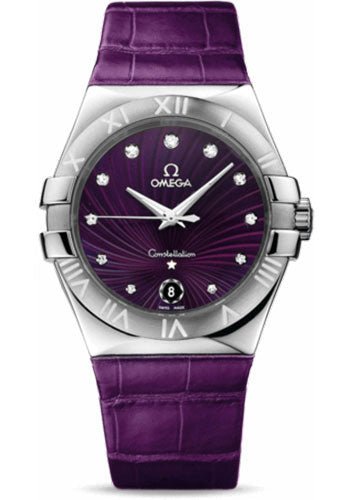 Omega Ladies Constellation Quartz Watch – 35 mm Brushed Steel Case – Purple Diamond Dial – Purple Leather Strap – 123.13.35.60.60.001