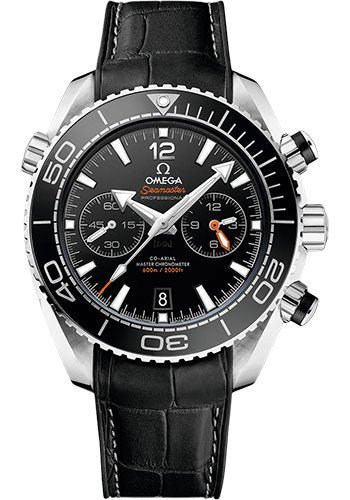 45.5 mm stainless steel case with anti-magnetic properties and helium escape valve, transparent back, screw-in crown, unidirectional rotating black ceramic bezel with Liquidmetal diving scale, scratch-resistant sapphire crystal, black ceramic dial with Arabic numerals and a date window at the 6 o’clock position, small seconds sub-dial, as well as 60-minute and 12-hour counters on one dial, caliber Omega 9900 self-winding Co-Axial master chronometer movement with chronograph function, approximately 60 hours of power reserve, black leather strap with rubber lining. Water resistant to 600 m (2000 ft).