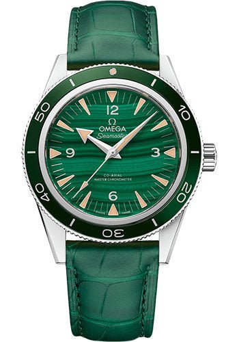 41 mm platinum case with anti-magnetic protection, transparent back, green ceramic bezel, domed scratch-resistant sapphire crystal with anti-reflective treatment inside, deep green dial domed, scratch-resistant sapphire crystal with anti-reflective treatment inside, Calibre Omega 8913 self-winding co-axial master chronometer movement, approximately 60 hours of power reserve, green leather strap. Water resistant to 300 metres (1000 feet).