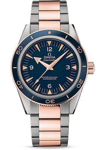 41 mm grade 5 titanium and 18K Sedna gold case, transparent back, screw-in crown, unidirectional rotating 18K Sedna gold bezel blue Ceragold ring and diving scale, domed scratch-resistant sapphire crystal with anti-reflective treatment on both sides, sand-blasted blue dial with 18K Sedna gold hands coated with vintage Super-LumiNova, self-winding chronometer Omega 8400 movement with Co-Axial Escapement, and resistance to magnetic fields greater than 15,000 gauss, approximately 60 hours of power reserve, grade 5 titanium and 18K Sedna gold bracelet. Water resistant to 300 m.