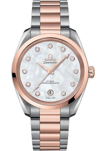 38 mm stainless steel and 18K Sedna gold case, transparent back, domed scratch-resistant sapphire crystal anti-reflective treatment on both sides, white pearled mother-of-pearl dial with a date window at 6 o’clock and 11 diamond indexes in 18K Sedna™ gold holders, Caliber Omega 8800 self winding movement with co-axial escapement, date, approximately 55 hours of power reserve, stainless steel and Sedna gold bracelet. Water resistant to 15 bar (150 metres / 500 feet).