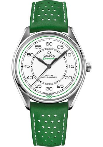39.5 mm steel case with anti-magnetic protection, transparent back, domed scratch-resistant sapphire crystal with anti-reflective treatment on both sides, white domed dial of each watch, Calibre Omega 8806 self-winding chronometer movement, approximately 55 hours of power reserve, green micro-perforated leather strap. Water resistant to 60 metres (200 feet).