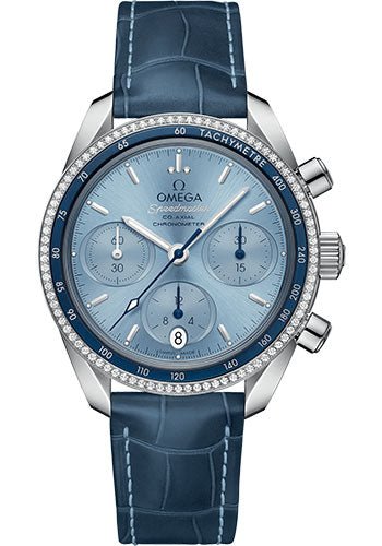 Omega Speedmaster 38 Co-Axial Chronograph Watch – 38 mm Steel Case – Dual Diamond Bezel – Ice Blue Dial – Blue Leather Strap – 324.38.38.50.03.001