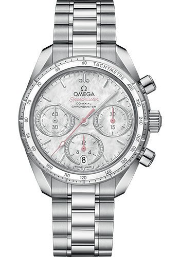 38 mm stainless steel case, bezel which includes a tachymeter scale on a white ceramic ring, scratch-resistant sapphire crystal anti-reflective treatment on both sides, white mother-of-pearl dial includes horizontal oval subdials which are diamond-trimmed and a vertical oval date window at 6 o’clock, tachymeter scale, Caliber Omega 3330 self winding movement with chronograph, chronometer, date, approximately 52 hours of power reserve, stainless steel bracelet. Water resistant to 10 bar (100 metres / 330 feet).