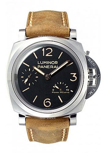 47mm AISI 316L polished steel case, see-through sapphire crystal back, brushed steel device protecting the crown, black dial with luminous Arabic numerals and hour markers, seconds at 9 o’clock, power reserve indicator at 4 o’clock, hand-wound Panerai P.3002 calibre movement with hours, minutes, small seconds, power reserve indicator, seconds reset, approximately 3 days of power reserve, brown leather strap. Water resistant to 100 meters.