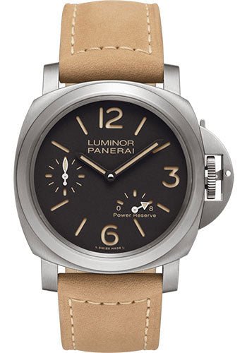 44mm brushed titanium case, brushed titanium bezel with polished edges, brown dial with luminous arabic numerals and hour markers, small seconds at 9 o’clock, power reserve indicator at 5 o’clock, P.5002 calibre handwound movement with hours, minutes, small seconds, power reserve indicator, approximately 8 days of power reserve, brown scamosciato strap with beige stitching. Water resistant to 30 bar (~300 metres).