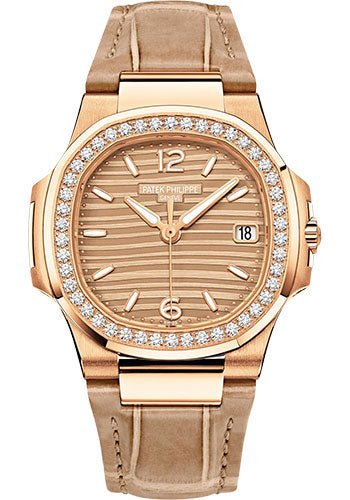 32 mm rose gold case, 6.9 mm thick, golden dial with applied gold hour markers with luminescent coating, caliber E23-250 S C quartz movement with date, sweep seconds hand, beige alligator strap with square scales, nautilus fold-over buckle. Water resistant to 60 m.