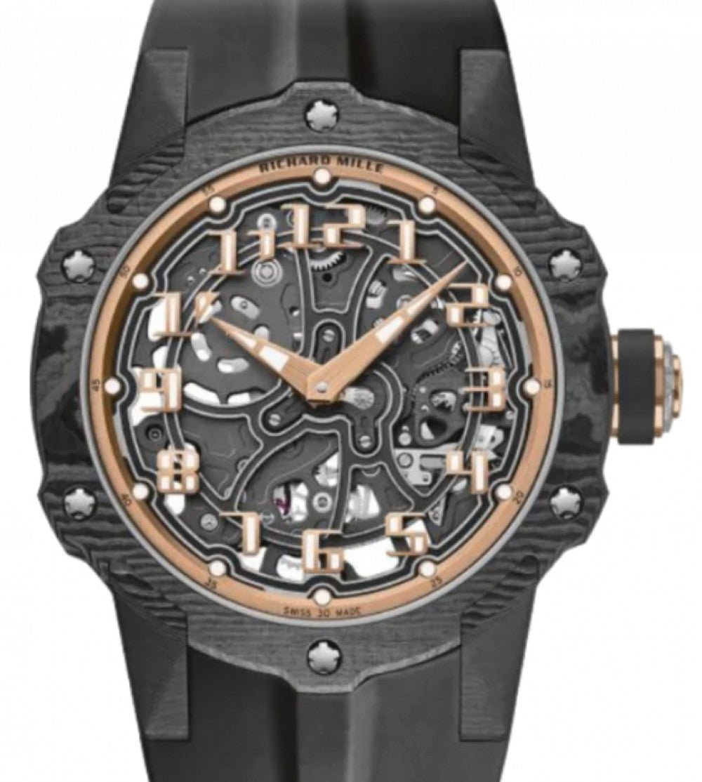 This certified authentic Brand New Richard Mille Automatic Winding Watch, with the Model Number: RM 33-02, has a Carbon 41 mm Round Case with Screw Down Crown and a . This Men’s Richard Mille Automatic Winding has an attractive Skeleton Dial with Arabic Dial Markers. The certified Swiss tested Richard Mille Automatic Movement will keep perfect time for you. The elegantly designed Richard Mille with will look great on your wrist. Richard Mille Automatic Winding Carbon Skeleton Arabic Dial 41 mm RM 33-02