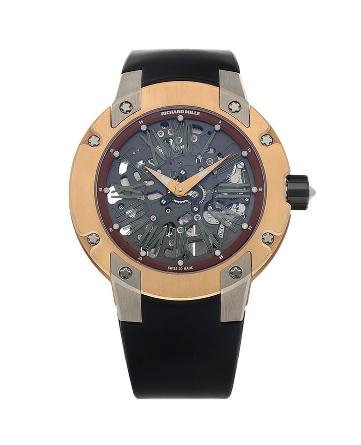 This certified authentic Brand New Richard Mille Automatic Winding Watch, with the Model Number: RM033, has a Rose Gold 45.7 mm Round Case with Screw Down Crown and a . This Men’s Richard Mille Automatic Winding has an attractive Skeleton Dial with Roman Dial Markers. The certified Swiss tested Richard Mille Automatic Movement will keep perfect time for you. The elegantly designed Richard Mille Rubber with will look great on your wrist. Richard Mille Automatic Winding Rose Gold Skeleton Roman Dial 45.7 mm RM033