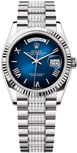 Rolex Day-Date 36 36mm Blue Ombré Dial Fluted Bezel with Diamond-Set President Bracelet – 128239 | 2024 Model