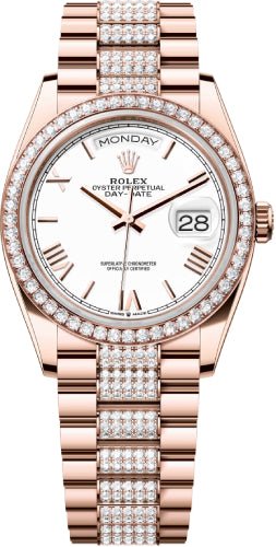 Rolex Day-Date 36 36mm White Roman Dial Diamond-Set Bezel with Diamond-Set President Bracelet – 128345RBR | 2024 Model