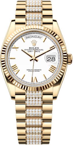 Rolex Day-Date 36 36mm White Roman Dial Fluted Bezel with Diamond-Set President Bracelet – 128238 | 2024 Model