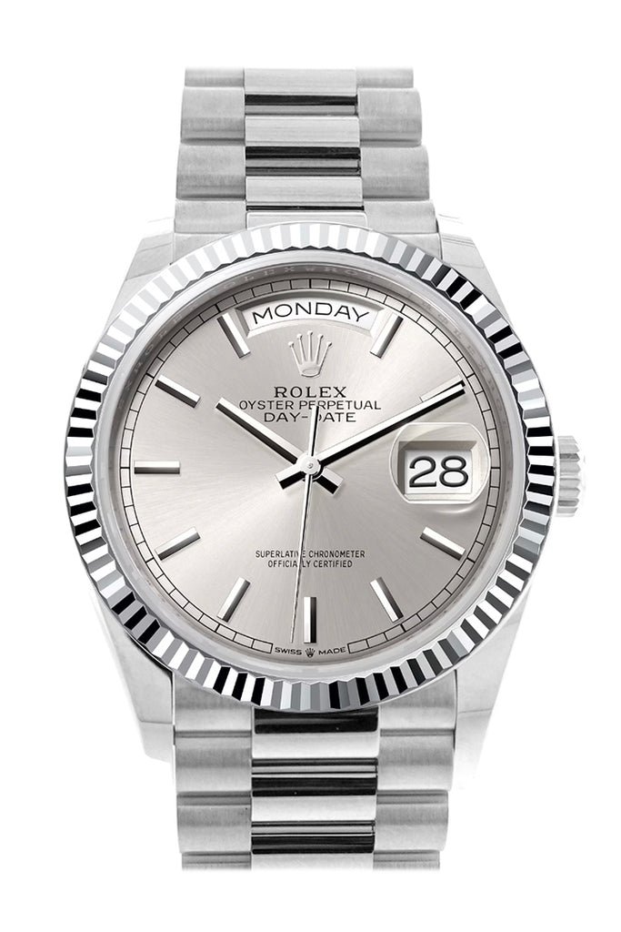More than a timepiece, this watch is an emblem of exclusivity and sophistication, embodying the legacy and heritage of the Rolex brand. The Rolex Day-Date 36 Silver Dial Fluted Bezel Platinum President Watch 128236 isn’t just a watch; it’s a symbol of distinction—a fusion of unparalleled craftsmanship and timeless style.